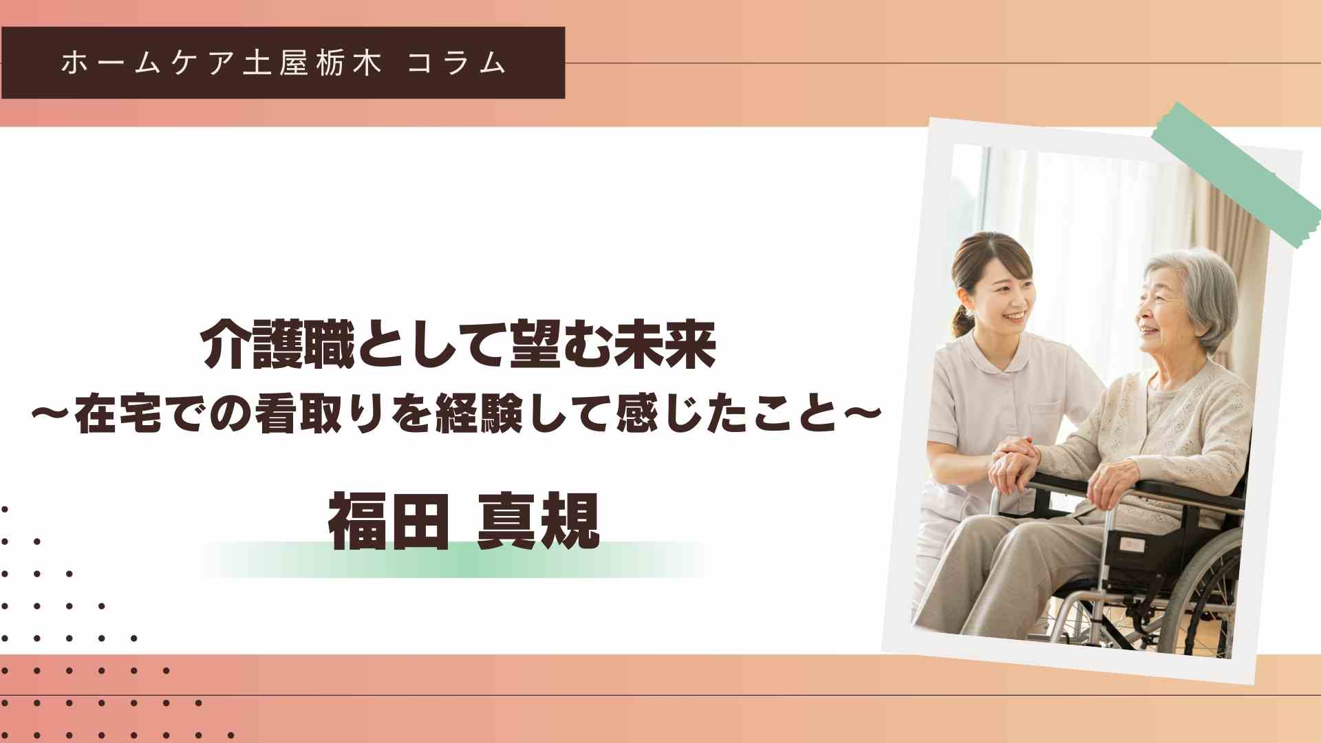 長時間一対一だからこそ大変なこともある。コミュニケーションって、とても大切だなといつも感じる。だけど、だからこそお互いも知れるし、だからこそ一人一人に合ったケアができる。どんな仕事よりも温かい。私はそう思います。5年後も10年後も、その先もずっと介護に関わる仕事がしたい。